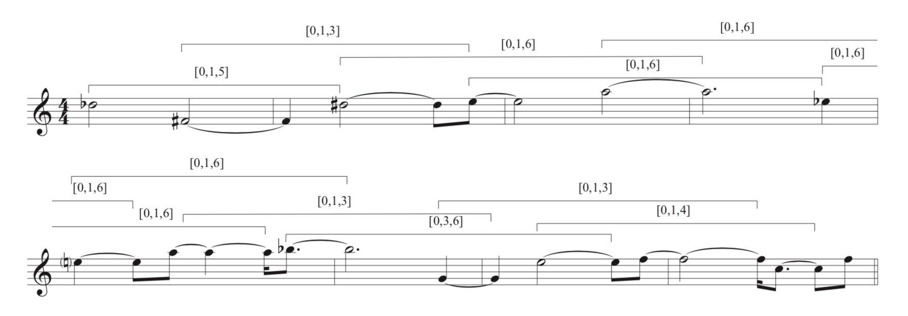 If you're able, you can see the melody is rather slow and long, but occasionally is mildly syncopated. Below, I've added the set class notations for each trichord above in brackets. (If that sounds very strange to you, here's a link that might help: Wikipedia on Musical Set Theory.)